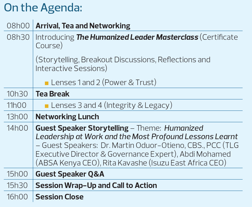 Delegate Tickets: 30,000 Ksh per person (includes your copy of The Humanized Leader)